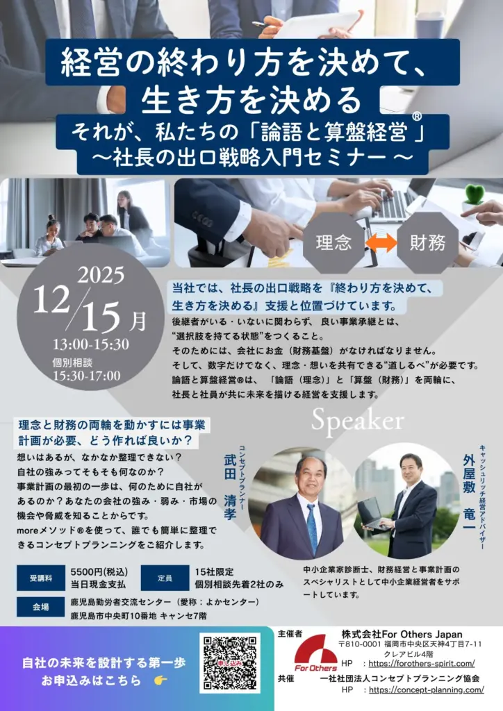 12月15日(月)に「社長の出口戦略入門セミナー」を鹿児島勤労者交流センターで開催いたします。